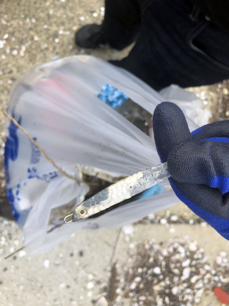 エギングで有名な漁港だけに磯場の漂着物の中にはエギが数多く見られました。他にもエサの袋や、ウキ、ライン等が時折混じっていました。